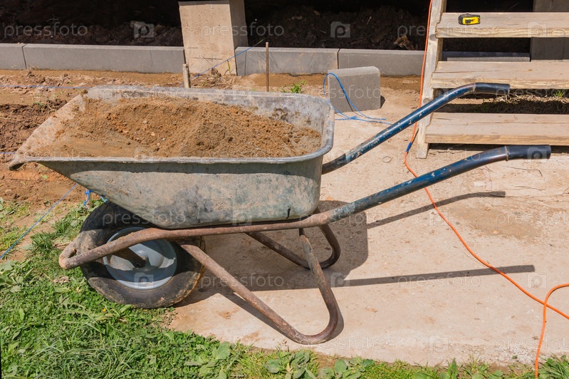 Строительная площадка с тачкой с песком
