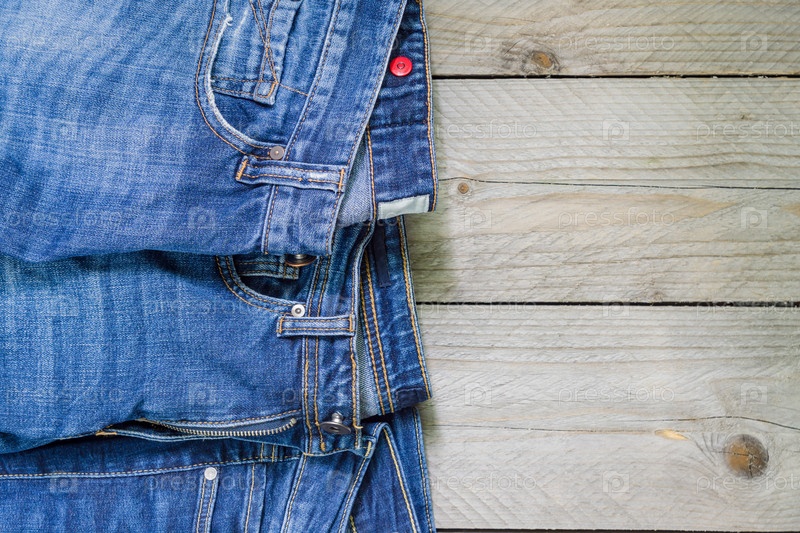 Вид сверху на синие джинсы, расположенные на деревянном фоне. Концепция красоты и модной одежды