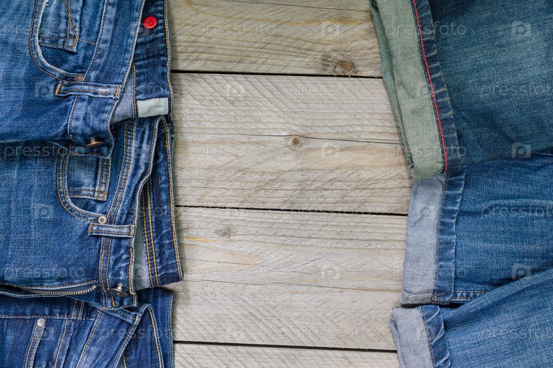 Вид сверху на синие джинсы, расположенные на деревянном фоне. Концепция красоты и модной одежды