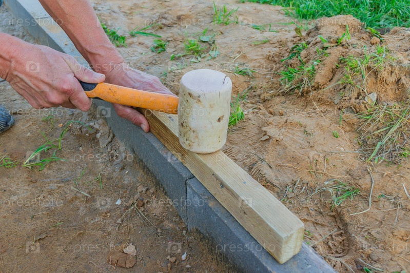 Укладка красной и серой бетонной брусчатки на заднем дворе. Мощение дорог, строительство