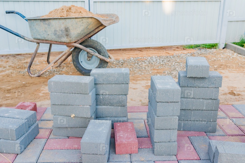 Рабочий укладывает красную и серую бетонную брусчатку. Мощение дорог, строительство