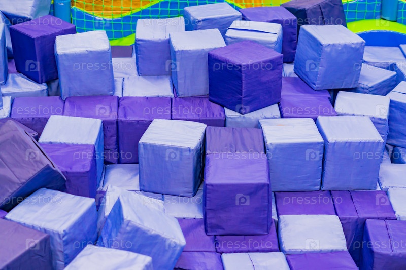 Много мягких синих блоков в детском сухом бассейне на игровой площадке. геометрические игрушки