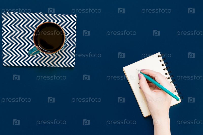 Вид сверху на чашку черного кофе и женскую руку, пишущую в блокноте на синем фоне с копировальным пространством