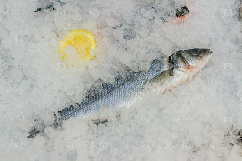 Свежий морской окунь во льду готов к приготовлению на рыбном рынке