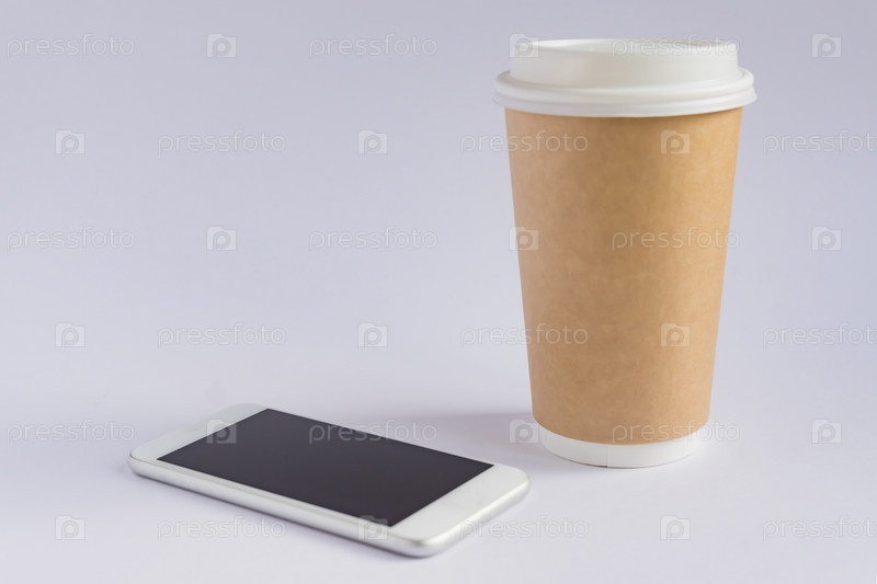 Бумажная кофейная чашка и металлический смартфон на сером фоне в стиле минимализма