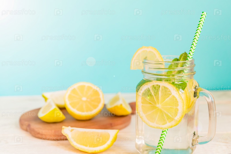 Стакан каменщика домашнего лимонада с лимонами, мятой и зеленой бумажной соломой на деревянном деревенском фоне. Летний освежающий напиток