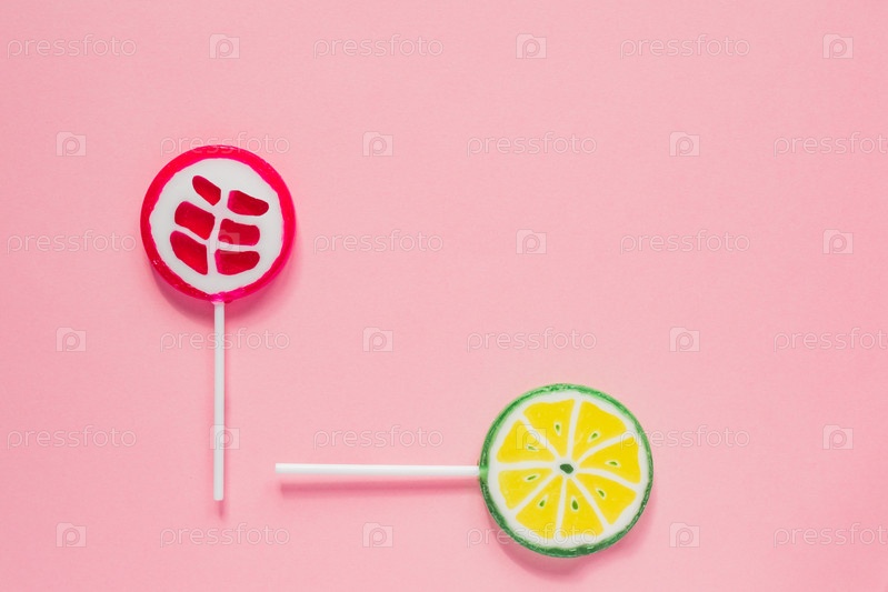 Сладкие вкусные леденцы на палочке на розовом фоне. Минимальная плоская планировка с копировальным пространством