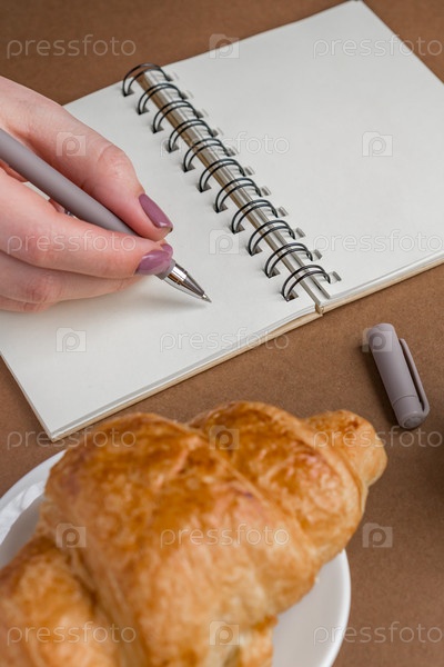 Женщина с маникюром пишет на блокноте. Фрилансер работает на открытом воздухе. Вкусный круассан на белой тарелке на столе