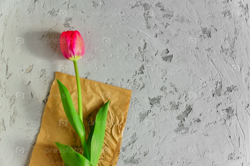 Вид сверху на свежий цветущий красный тюльпан на крафт-бумаге и сером текстурированном фоне. Копировать пространство