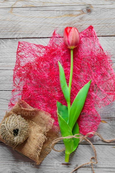 Вид сверху на букет весенних цветов. розовый тюльпан на деревянном фоне. Скопируйте пространство