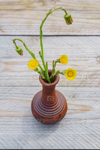 Свежесрезанные желтые цветы мать-и-мачехи в глиняной вазе на деревянном столе на открытом воздухе. Деревенский стиль
