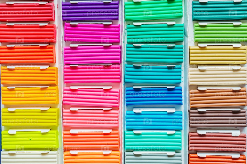 Цвета радуги из пластилина. Разноцветные пластилиновые батончики в коробке, фоновая текстура
