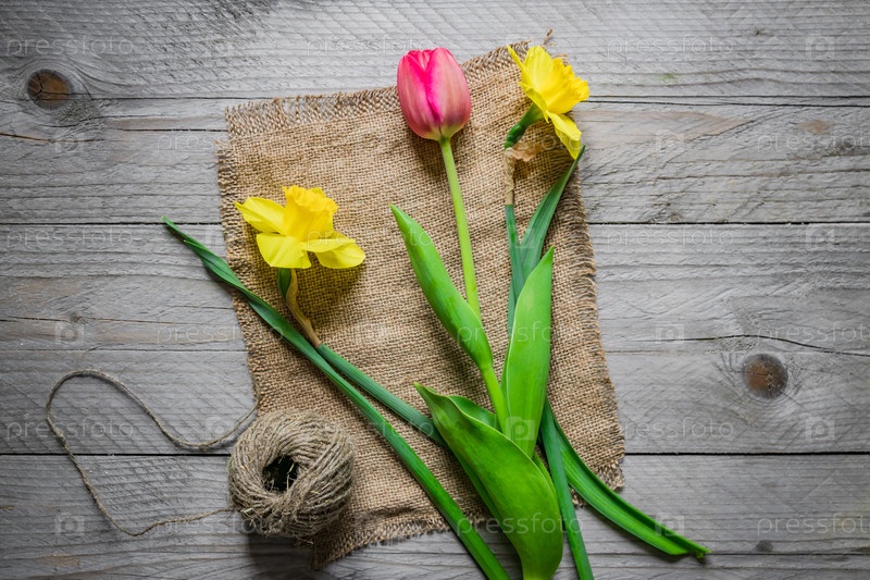Вид сверху на букет весенних цветов. Желтые нарциссы и розовый тюльпан на деревянном фоне. Скопируйте пространство