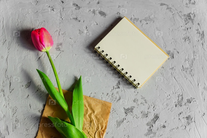 Красивый свежесрезанный розовый тюльпан и пустая спиральная записная книжка на сером бетонном фоне. Макет с копией пространства