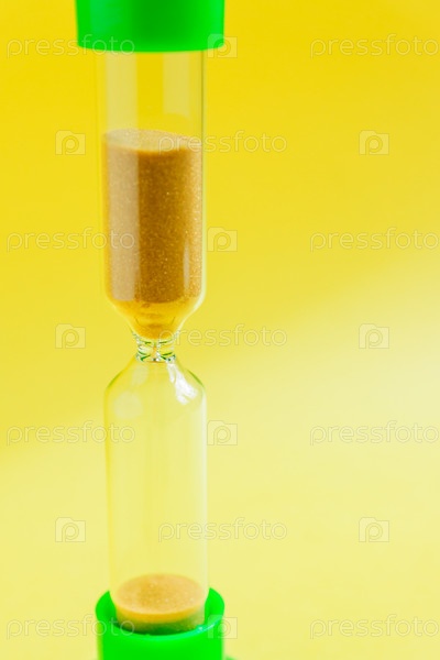Песочные часы на желтом фоне с копией пространства. Концепция управления временем