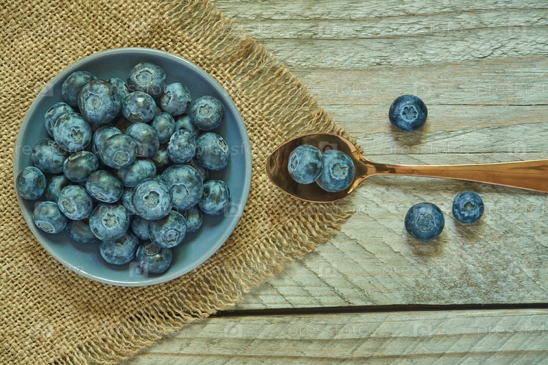 Вид сверху на миску с черникой на деревянном столе и ткани из мешковины