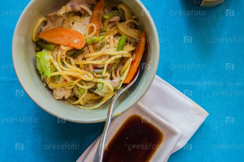 Азиатская лапша с курицей, овощами в миске, крупным планом. ужин в азиатском стиле