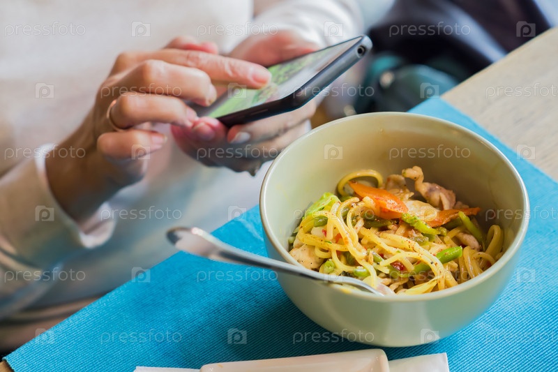 Женщина ест китайскую лапшу с курицей и обменивается сообщениями на смартфоне за обедом