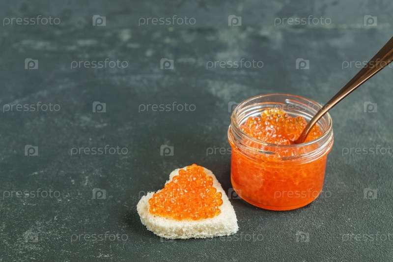 Красная икра на сером фоне, морепродукты. Здоровое питание и диета. Скопируйте место для текста