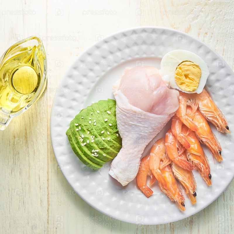 Вид сверху на кетогенную пищу - курицу, креветки, яйцо, авокадо и оливковое масло extra vin. Концепция здорового питания