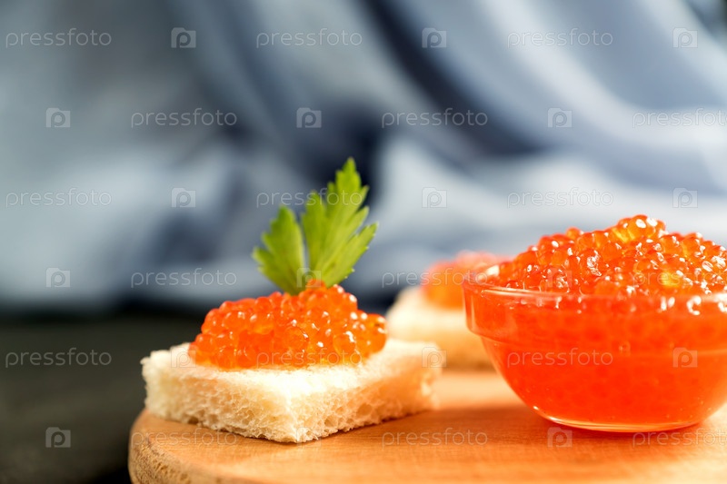 Вкусная красная икра на пшеничном хлебе с петрушкой на деревянном столе