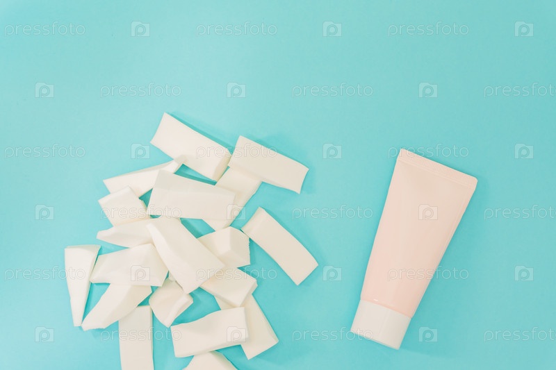 Губки для нанесения основы для лица и розовая трубка с жидкой основой на синем фоне