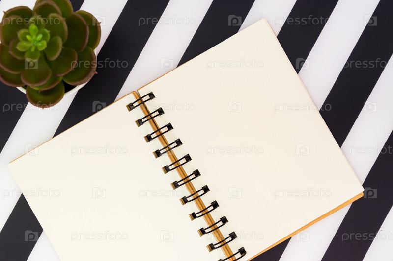 Вид сверху на открытую пустую тетрадь и сочные на черно-белом полосатом фоне. Стильная минималистичная плоская планировка