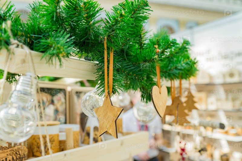 Новогоднее украшение интерьера. Деревянные игрушки разной формы (звезда, сердце, елка), висящие на ветке елки