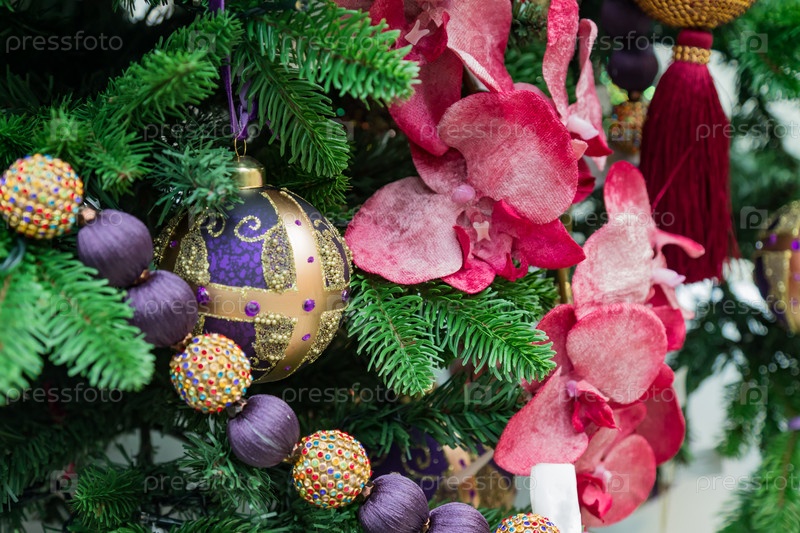 Рождественские и новогодние праздники фон. Рождественская елка украшена фиолетовыми безделушками, орхидеями и гирляндами. Блестящие и сверкающие. Концепция праздника