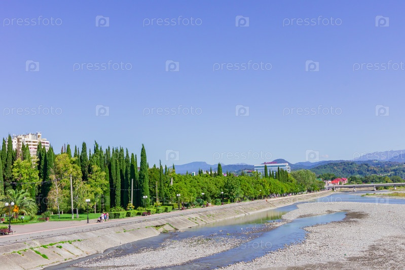 СОЧИ, РОССИЯ - 07 сентября 2019 г.: Вид на набережную реки Мзымта в Роза Хутор