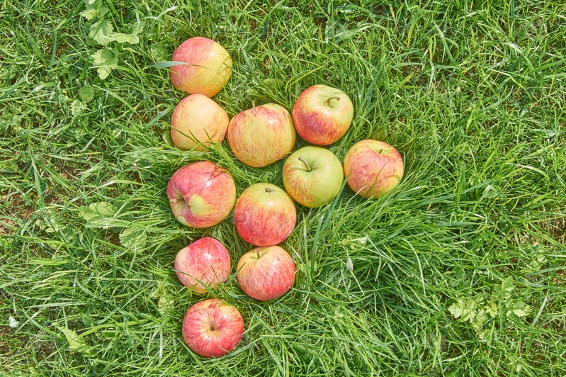 Упавшие спелые яблоки под яблоней на траве