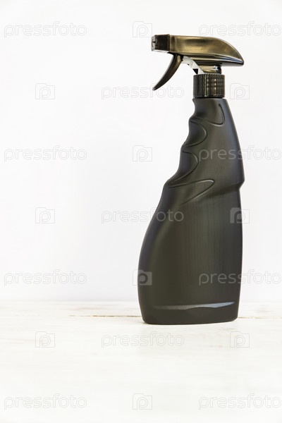 Черная пустая пластиковая бутылка с моющим средством на белом фоне. Бытовая химия. Чистящее средство