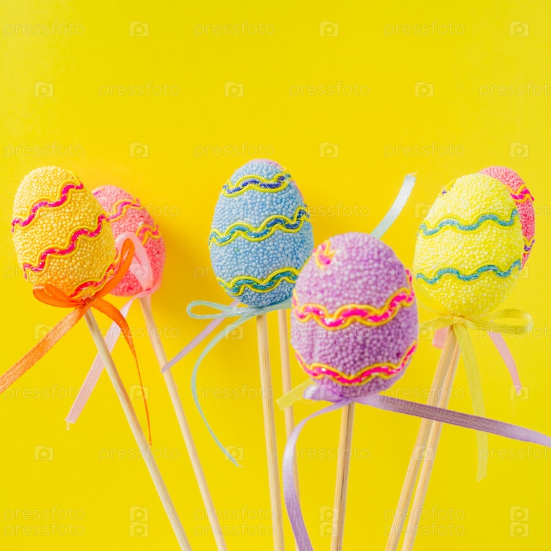 Пасхальные красочные украшенные яйца стоят на палочках на желтом фоне. Минимальная пасхальная концепция. Счастливой Пасхи открытка с копией пространства для текста