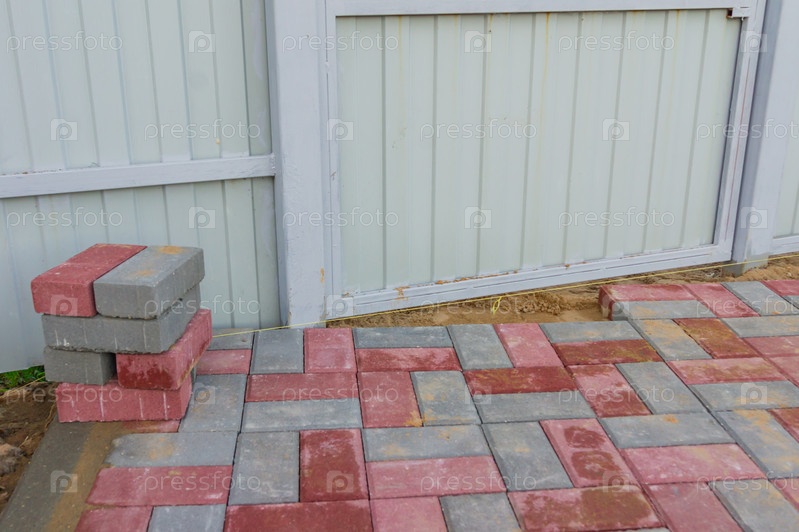 Укладка красной и серой бетонной брусчатки на заднем дворе. Мощение дорог, строительство