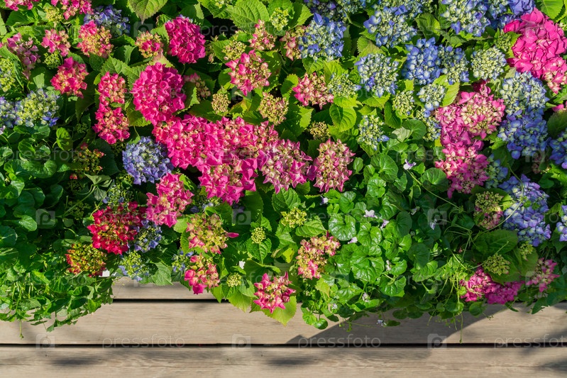 Вид сверху на розовую и голубую цветущую гортензию на клумбе. Естественный цветочный фон с копией пространства