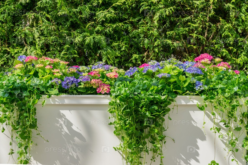 Розовая и голубая цветущая гортензия на клумбе. Естественный цветочный фон с копией пространства