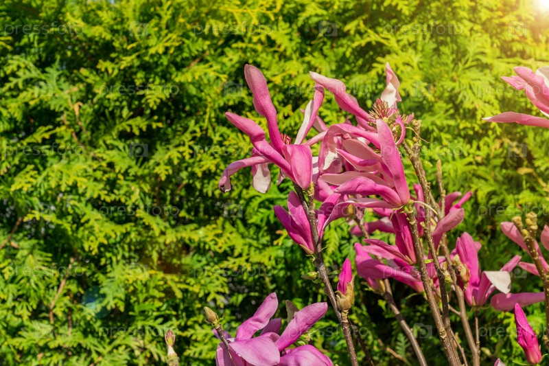 Розовая цветущая магнолия в парке в солнечный весенний день