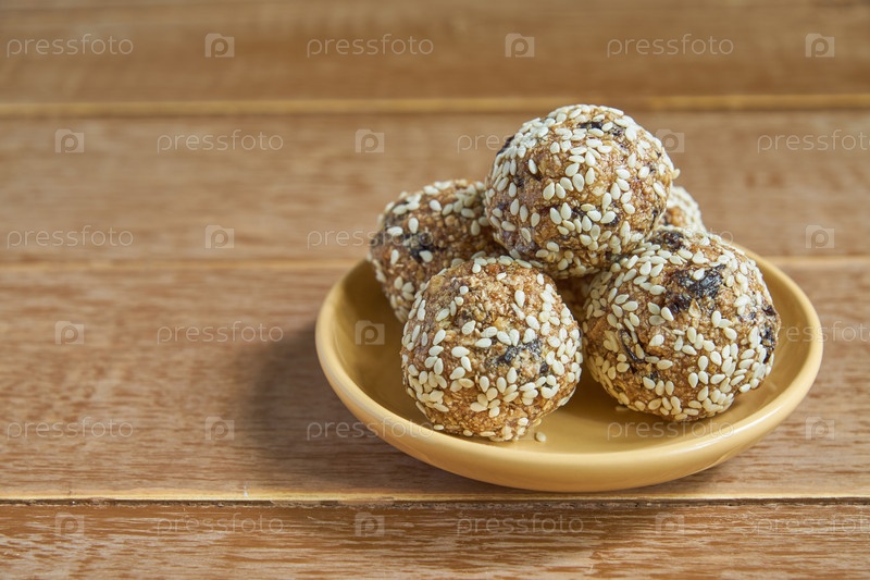 Овсяно-кунжутные протеиновые шарики. Укусы с низким содержанием жира с овсянкой, орехами, кунжутом и черносливом на деревянном фоне