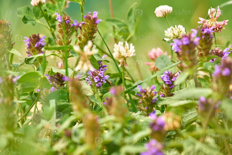Крупный план луговых цветов. Цветущий белый и фиолетовый дикий клевер