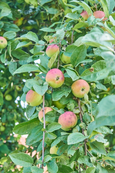 Красное вкусное яблоко. Блестящие вкусные яблоки, свисающие с ветки дерева в яблоневом саду