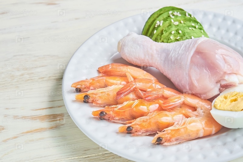 Концепция кетогенной диеты с низким содержанием углеводов на тарелке. Здоровое питание и диета с креветками, авокадо, яйцами и кунжутом