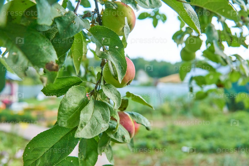 Красное вкусное яблоко. Блестящие вкусные яблоки, свисающие с ветки дерева в яблоневом саду