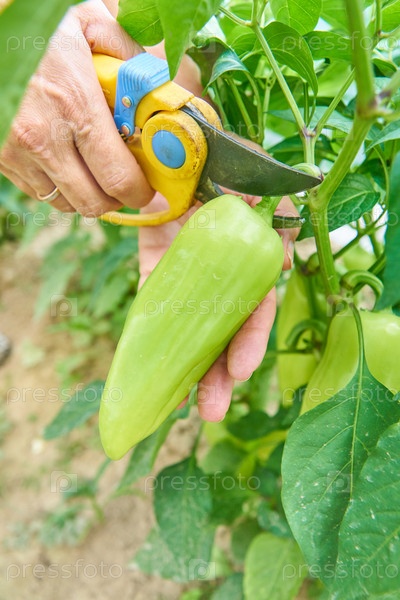 Фермер собирает органический спелый перец в теплице садовым секатором. Концепция сельского хозяйства и садоводства