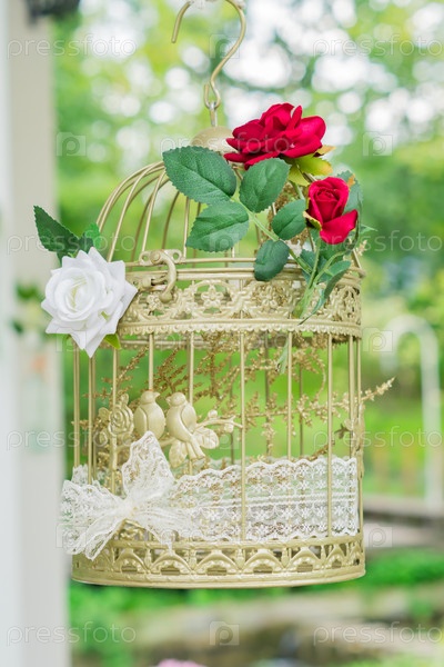 Декоративная клетка для птиц на открытом воздухе. Свадебный декор с красными и белыми розами