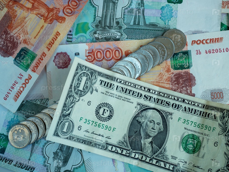 Один доллар и несколько купюр в тысячу и пять тысяч российских рублей и монет, крупный план