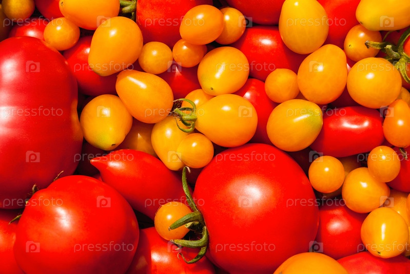 Сочетание красных и желтых спелых помидоров разного размера в качестве фона