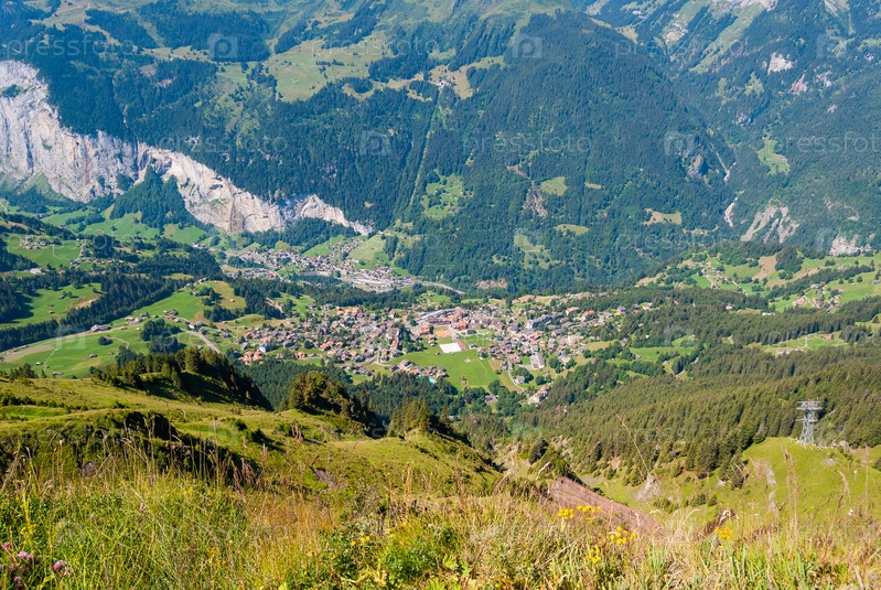 Вид на долину в горах с вершины региона Маннлихен Юнгфрау, Берн, Швейцария