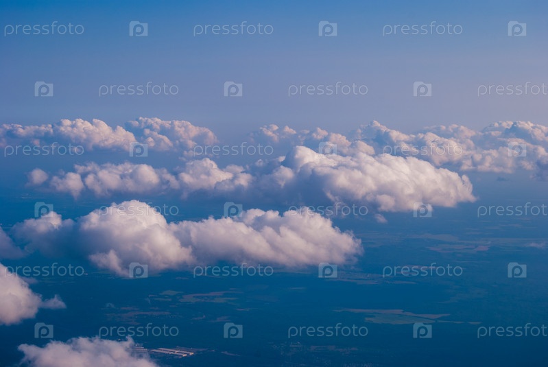 Вид сверху на облака и голубое небо из окна самолета, фон природы