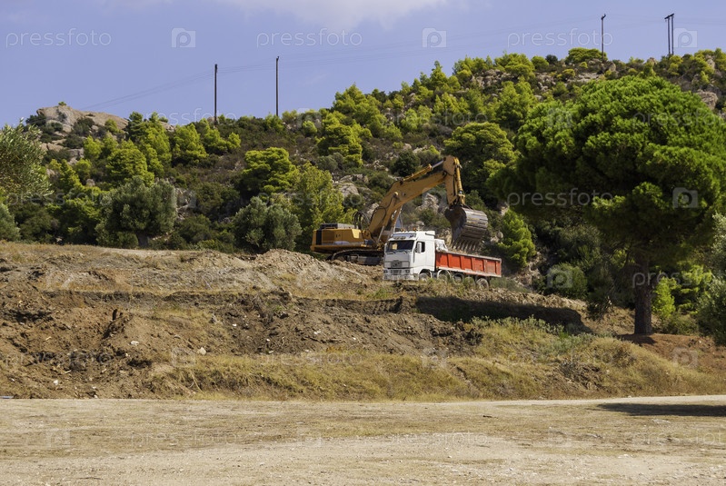 Экскаватор загружает почву самосвала на строительной площадке