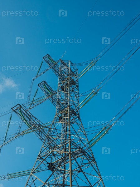 Высоковольтная линия электропередач на фоне голубого неба